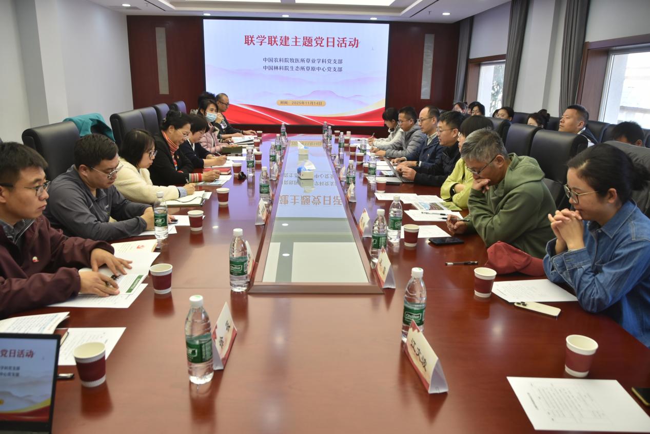 双方共同学习了党的二十届四中全会精神,围绕党建与业务互融互促展开深入研讨。在交流座谈中,白建华全面介绍了生态所的发展历程、学科布局,以及草原生态保护领域的科研优势;王勇系统回顾了牧医所的历史沿革,重点分享了草业学科的发展脉络与重大科研成就。一致认为,生态所草原中心在草种资源收集和培育、“三北”工程建设、盐碱草地生态修复等领域成果颇丰,牧医所草业学科在牧草种质创新和高产栽培、草牧业可持续发展等方面优势显著,双方优势互补,具备深化合作的坚实基础。未来将在科研项目联合申报、数据资源共享、人才培养交流、科研平台建设、成果示范推广等方面加强全方位协作,持续推动牧草产业高质量发展,为保障国家粮食安全和生态安全、推动乡村全面振兴提供科技支撑。