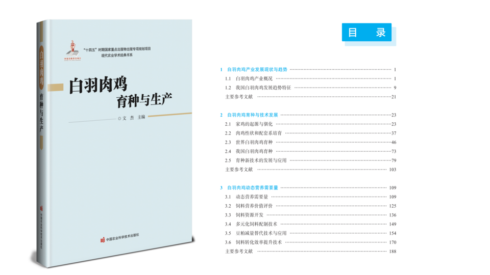 近日,中国农业科学技术出版社正式出版《白羽肉鸡育种与生产》一书。该书由中国农业科学院北京畜牧兽医研究所文杰研究员担任主编,并获得国家出版基金项目资助,是一部全面系统呈现白羽肉鸡全产业链科研与核心技术的著作。