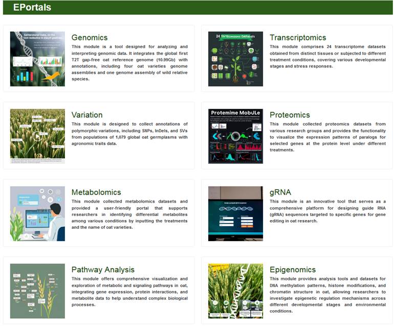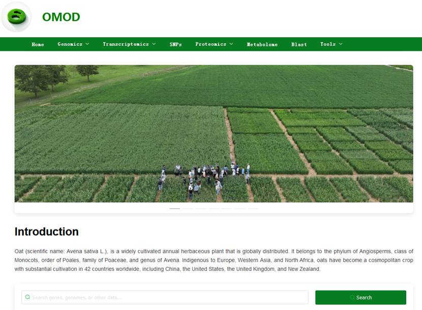 FGGD主要包括饲用燕麦、紫花苜蓿等优质饲草的高质量基因组序列及其注释信息、基因组变异分布信息(SNPs)、转录组、蛋白质组和代谢组等海量数据。该数据库采用先进的网站架构,设计了基因组学、转录组学、变异组学、蛋白质组学、代谢组学和数据分析等六大核心功能模块,配备了丰富的交互式可视化工具,帮助用户从多组学层面解析复杂的基因调控网络并支持动态展示,为科研人员提供“一站式”数据查询与分析服务。